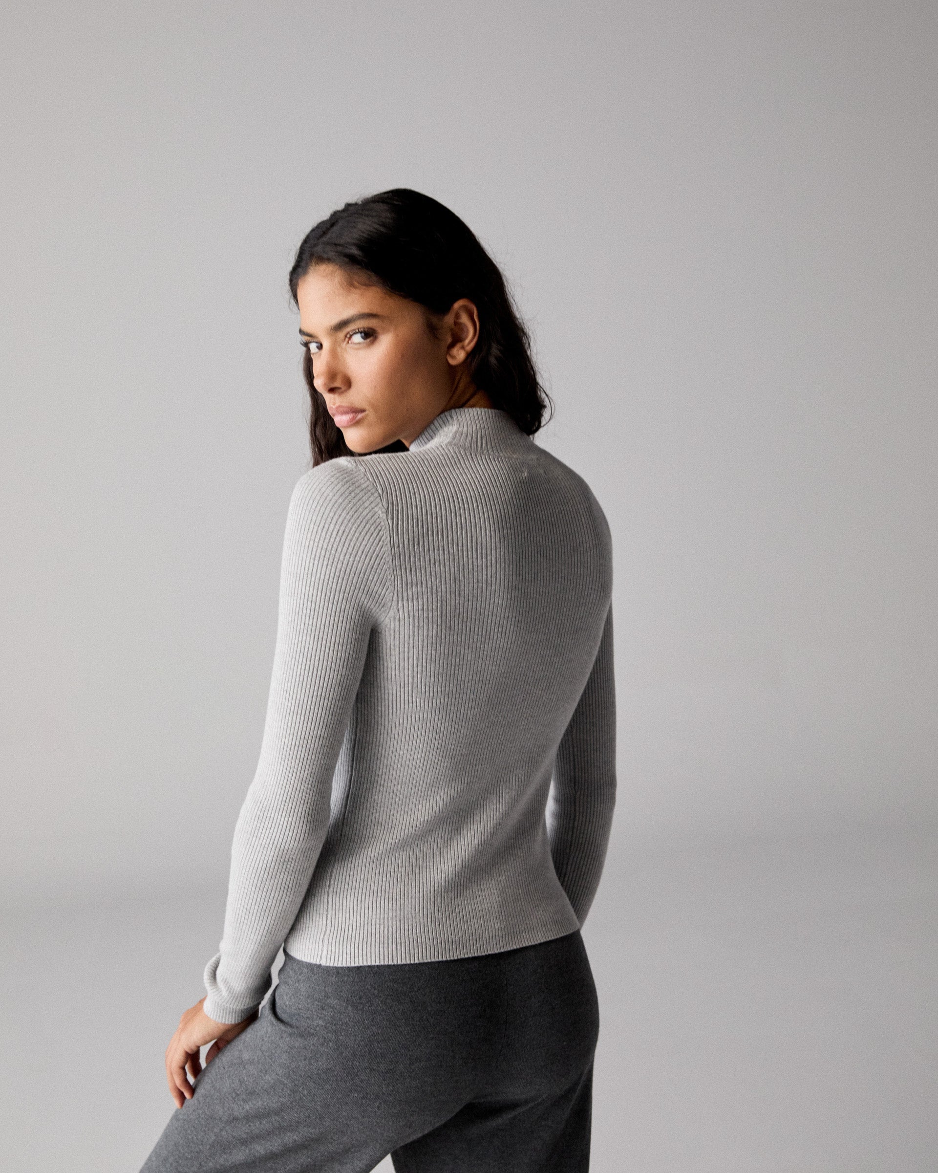 Branded Rib Knit Mock Neck Top - Light Grey Melange