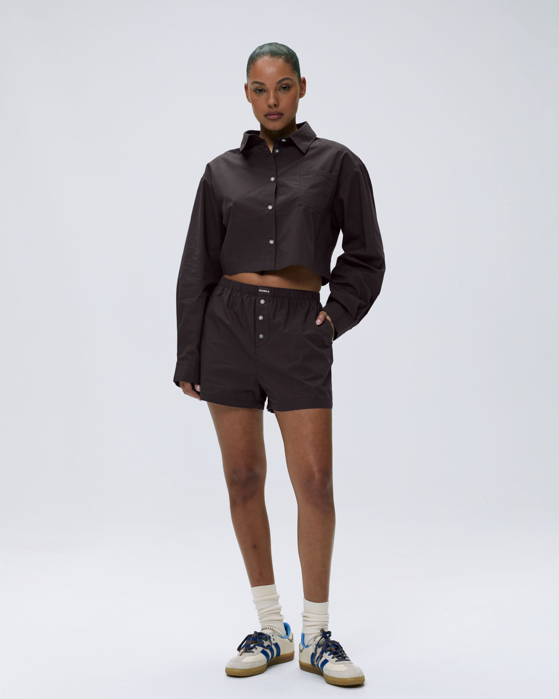 Cotton basics just got better. Our Cotton Cropped Shirt is cut from 100% Cotton fabric for a relaxed cropped fit and features a banded woven tab detail on the back. Style yours with the matching shorts or pants for a laid back look.