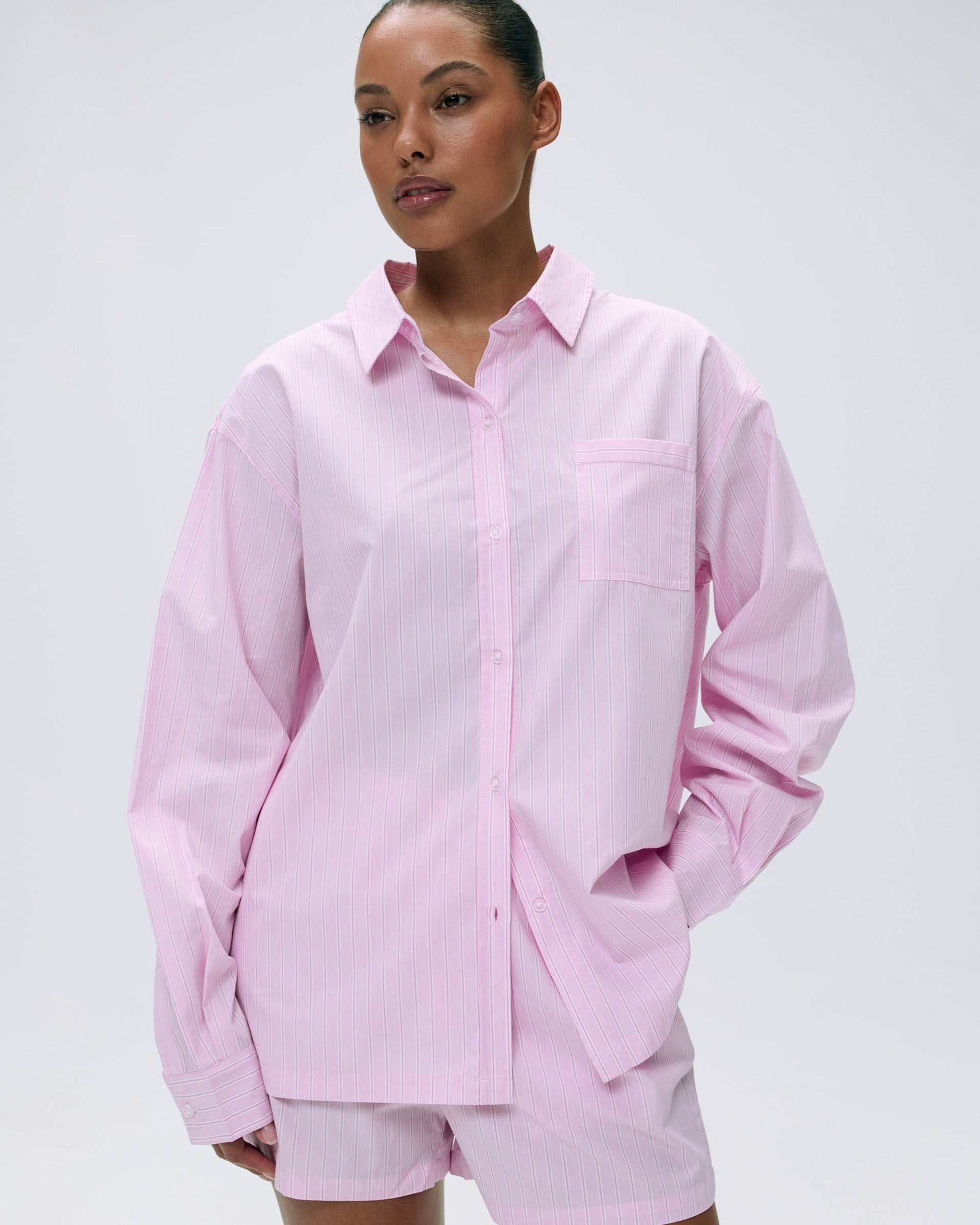 Introducing the Cotton Stripe Oversized Shirt. Made from a naturally airy. breathable Cotton fabric; the perfect lounge look for your rest days. Wear yours with the matching shorts or Cotton Pull on Pants.