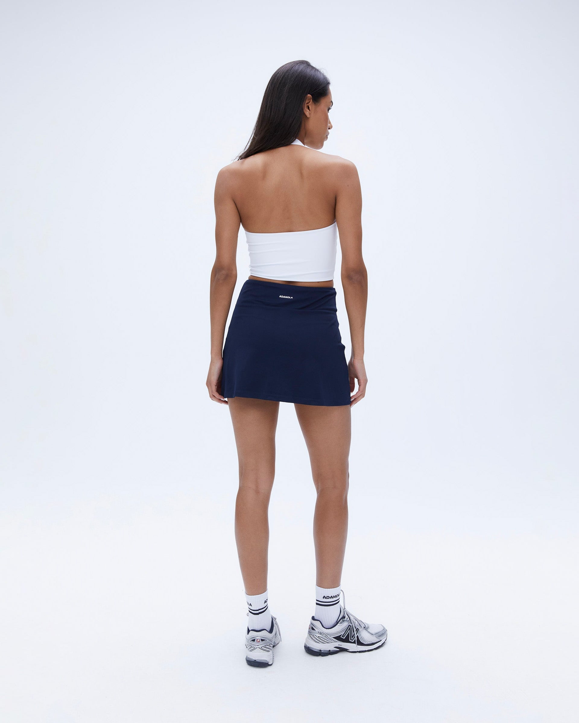 This chic Halter Neck Top features a low cut neckline. low back design and tonal logo. This super flattering silhouette will make you look and feel good this summer. Style yours with the A-line Mini Skirt.