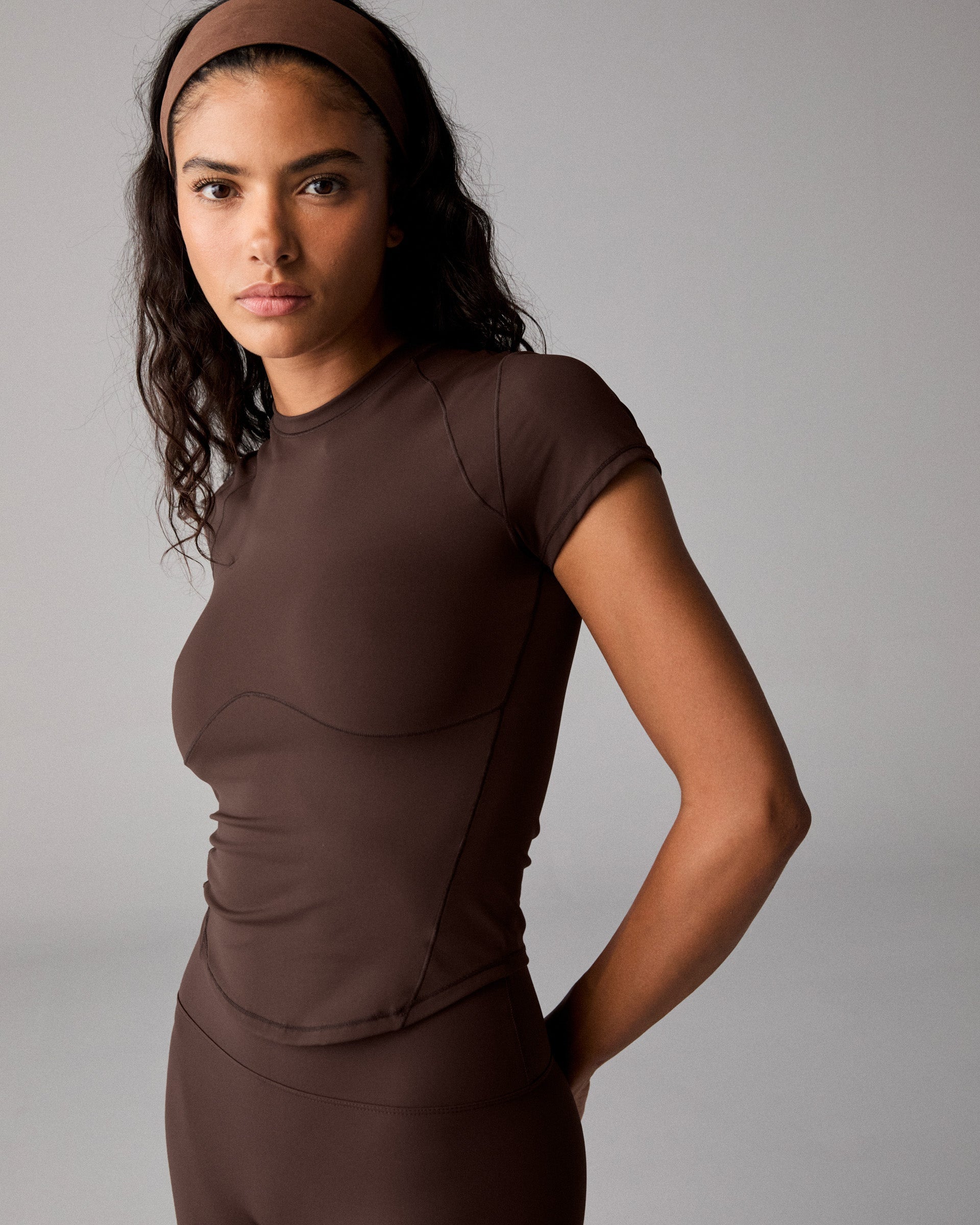 Ultimate Short Sleeve Seam Detail Curved Hem Top - Chocolate Brown